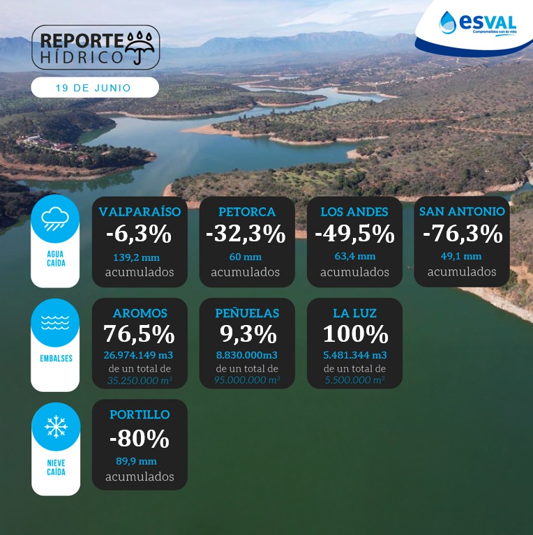“Las precipitaciones son muy importantes, especialmente en aquellas reservas hídricas que sólo tienen una fuente pluvial, como el lago Peñuelas y el tranque La Luz. Actualmente, tenemos un promedio del 31% de llenado de embalses en la región, lo que es un alivio significativo para mitigar la sequía que nos afecta”, señaló el ejecutivo.